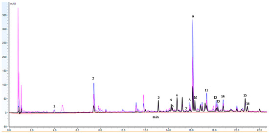 An UHPLC-DAD method for the quantitative determination of the main compounds in the extract from T. balsamita (ETB) was developed. A total of 16 analytes, including 7 acylquinic acids (1, 2, 8, 9, 12, 13, and 14), rosmarinic acid (11), and 8 flavonoids (3, 4, 5, 6, 7, 10, 15, and 16) were determined in ETB. An UHPLC-DAD chromatogram of ETB is presented in Figure 1. Analytical characteristics of the UHPLC-DAD method are presented in Table 1. The linear regression for the calibration curves showed good linear relationships with r2 > 0.9890 within the test ranges. The content of the assayed compounds is revealed in Table 2.