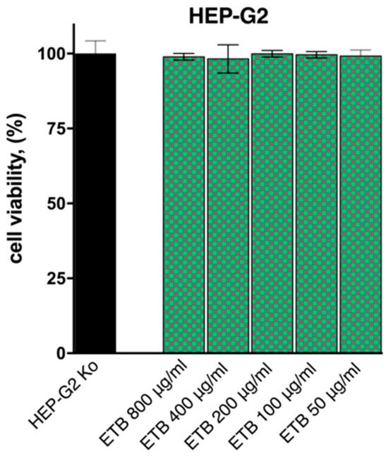 Cell viability of the HEP-G2 cell culture was evaluated following a 72 h exposure to 5-fold serial dilutions of the ETB (concentration range 800–400 μg/mL) using a standard methodology for assessing cell viability known as the Mosmann MTT method. Exponential-phased cells were harvested and seeded (100 μL/well) in 96-well plates at the appropriate density (1.5 × 105). After 24 h, cells were treated with different concentrations of the tested material and incubated for 72 h under standard conditions. Filter-sterilized MTT substrate solution (5 mg/mL in PBS) was added to each well of the culture plate. A further 2–4 h incubation allowed for the formation of purple insoluble formazan crystals, which were dissolved in isopropyl alcohol solution containing 5% formic acid. Absorbance was measured at 550 nm and collected absorbance values were blanked against MTT- and isopropanol solution and normalized to the mean value of untreated control (100% cell viability).