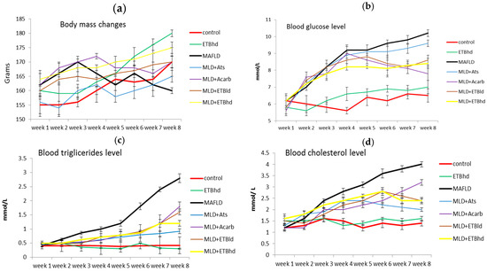The dynamics of changes in total cholesterol levels were similar to the fluctuations observed in triglyceride levels (Figure 3d). Compared to the beginning of the experiment, the highest elevation in cholesterol levels at the end of the period was registered in the MAFLD group (by 233%), followed by the cholesterol level in the metabolic animals treated with acarbose (by 167%). The increase in cholesterol level at the end of the experimental period was prevented to the greatest extent by atorvastatin and ETBhd by approximately 50%.