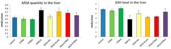 Levels of malonedialdehide (MDA) and reduced glutathione (GSH) in the liver homogenates. * p ≤ 0.01 vs. control; + p ≤ 0.01 vs. MAFLD. Results are expressed as mean ± SD (n = 5). The significance of the data was assessed using the Bonferroni-corrected Mann–Whitney U test. Values of p ≤ 0.01 were considered statistically significant.
