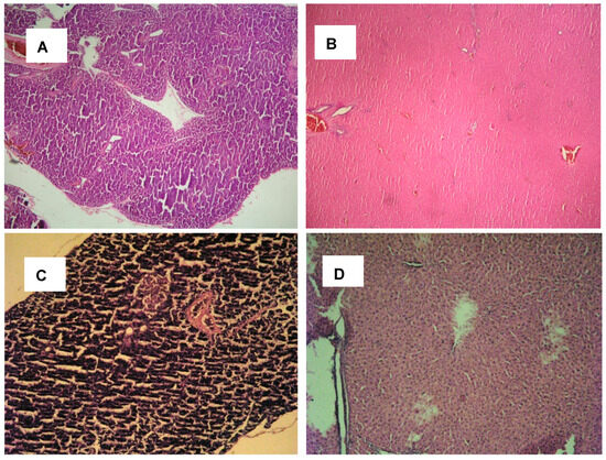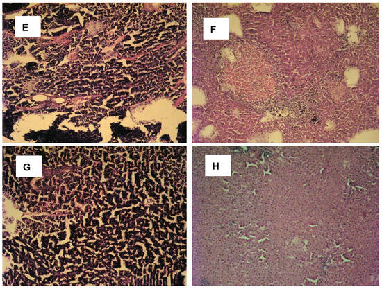 A histological examination of pancreas and liver sections from the experimental groups of rats is presented in Figure 5. Pancreas (A) and liver (B) tissues from the control group were with normal morphological architecture structures. MAFLD rats revealed pathological changes in the pancreas (C) with degenerative parenchymal alterations and liver (D) with centrilobular degenerative parenchymal amendments. Pancreas (E) and liver (F) tissues from MAFLD rats treated with acarbose presented a regenerated hepatocyte structure and pancreatic parenchyma. MAFLD rats treated with ETB revealed a regenerated hepatocyte structure (G) and pancreas (H) with hyperplastic islets of Langerhans and preserved cellular parenchyma.