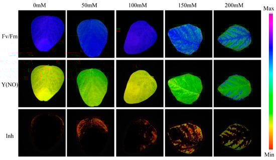 Pseudo-color images of Fv/Fm, Y(NO), and Inh parameters of soybean seedlings under different salt concentration stresses.
