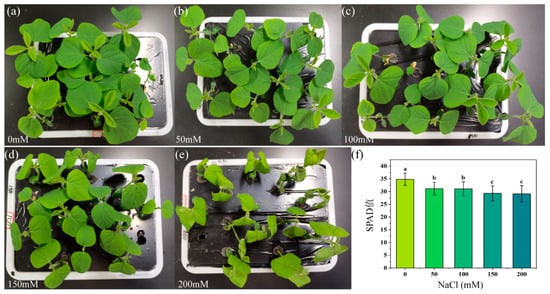 Soybean seedling images and leaf SPAD values under various salt concentration stress. (a–e): Phenotypic images of soybean seedlings treated with 0, 50, 100, 150, and 200 mM NaCl, respectively. (f): SPAD values measured from the leaves of soybean seedlings under different salt concentrations of salt stress treatment. Values shown are means ± SD of three measurements taken in all leaves per treatment. The lowercase letters in the bar charts represent significant differences between the indicated groups as tested with a one-way analysis of variance (ANOVA, p < 0.05).