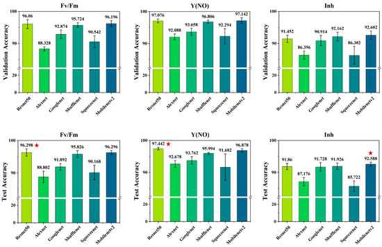 By separately utilizing three types of ChlF images as model inputs, we employed six convolutional neural networks (CNNs) for salt concentration recognition and established salt stress state discrimination models. The model accuracy of different inputs was analyzed and compared to further select the best CNN model. The salt stress recognition accuracy of each method is shown in Figure 4. The results indicate that among the six CNN models, Resnet50 performed best for the Fv/Fm parameter with test and validation accuracies of 96.298% and 96.06%, respectively, surpassing Squeezenet by 6.13% in test accuracy and 5.92% in validation accuracy. For the Y(NO) parameter, Resnet50 also excelled with test and validation accuracies of 97.442% and 97.076%, respectively, outperforming Alexnet by 4.764% in test accuracy and 4.988% in validation accuracy. Regarding the Inh parameter, Mobilenetv2 achieved the highest test accuracy of 92.588%, exceeding Squeezenet by 6.866% in test accuracy and 6.28% in validation accuracy.