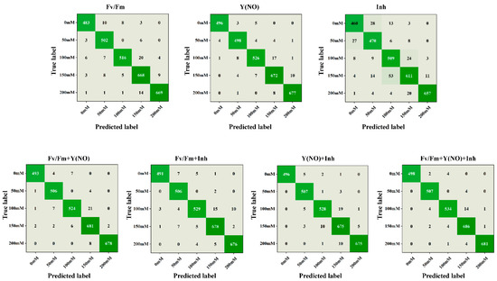 When classifying salt concentrations based solely on the Fv/Fm parameter of ChlF images, a high level of concordance between the true and predicted labels is generally observed, indicating favorable performance of the images in salt concentration classification. However, at elevated salt concentrations such as 150 mM and 200 mM, occasional instances of misclassification may occur. Upon incorporating the Fv/Fm and Y(NO) features, a marginal enhancement in classification performance is noted, particularly evident at intermediate concentrations (100 mM and 150 mM), suggesting a discernible role of the Y(NO) feature in distinguishing these concentration levels. Conversely, when employing the Inh feature for classification, a higher incidence of misclassification is observed at high salt concentrations (150 mM and 200 mM), possibly attributed to the suboptimal performance of this feature under such conditions. Finally, the amalgamation of all three features for classification yields an overall improvement in performance, particularly pronounced at high salt concentrations. This underscores the comprehensive information capturing capability of the combined features in ChlF images, consequently enhancing classification accuracy.
