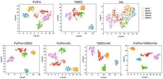Upon examining the scatter plots of single-type ChlF image features, it was observed that the Fv/Fm features displayed the best distribution, followed by Y(NO), while the distribution of Inh features was the most chaotic. This was evidenced by the intersecting phenomena among different salt concentrations in the scatter plot of Inh features. However, the scatter plot distribution of fused features was notably superior to that of single-type ChlF image feature scatter plots. In the scatter plot of fused features, distinct clustering phenomena were observed, with clear delineation of 5 clusters corresponding to 5 salt concentrations. Moreover, the scatter plot of fused features resulting from the fusion of three types of ChlF image features demonstrated the best performance, with tightly clustered points within each cluster structure and minimal occurrence of crossing or overlapping phenomena between cluster relationships, along with fewer outliers or anomalous points.