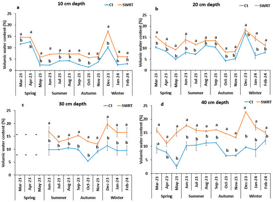 Monthly variation of soil moisture profile in the absence or the presence of subsurface water retention technology treatment at different soil depths: (a) 10 cm depth, (b) 20 cm depth, (c) 30 cm depth, (d) 40 cm depth. Ct: control, SWRT: subsurface water retention technology. Data denoted are means of five replicates (n = 5) ± standard error (SE). Different letters within the same month designate significant differences at p < 0.05 based on Tukey’s test.