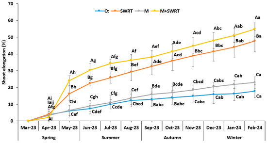 Monthly variation of shoot elongation in the absence and the presence of subsurface water retention technology and/or mycorrhiza. Ct: control; SWRT: subsurface water retention technology; M: mycorrhiza; M + SWRT: mycorrhiza + subsurface water retention technology. Data denoted are means of five replicates (n = 5) ± standard error (SE). Different capital letters within the same month indicate significant differences between treatments and different lower-case letters within the same treatment indicate significant differences between months at (p < 0.05) based on Tukey’s test.