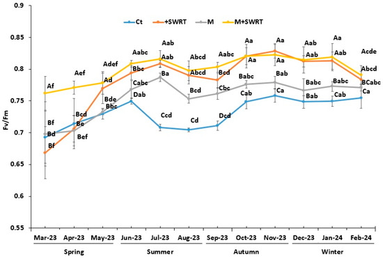 Our results showed that the application of SWRT treatment alone and in combination with mycorrhiza had a significant effect on Fv/Fm compared to the Ct (Figure 3). Indeed, SWRT and M + SWRT treatments showed significant enhancement of this trait compared to the control throughout the year, with increase percentages ranging from 7 to 22%. The greatest increases for SWRT (19, 20, and 22%) were recorded in July, October, and November 2023, respectively, and the greatest ones for M + SWRT (19, 21, and 21%) were also recorded during the same period. However, the smallest percentages of increase were recorded for M treatment, ranging from 1 to 8%, offering a slight improvement over Ct.