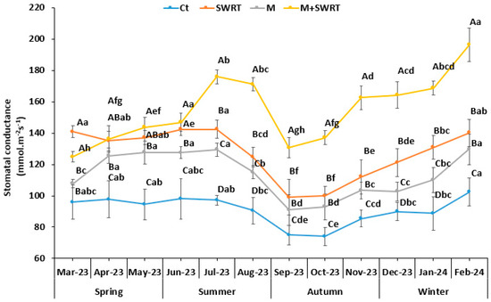 Stomatal conductance (gs) results showed a significant difference among the applied treatments and throughout the study period. Indeed, both SWRT and M + SWRT treatments showed the highest values of gs compared to the control (Figure 4), with the greatest increase percentages observed for M + SWRT treatment, ranging from 18 to 59% where the greatest increase was observed in February 2024. SWRT treatment came second and showed an almost steady increase compared to the Ct with the highest enhancement recorded in July 2023 (33%). Meanwhile, M treatment showed slight increases compared to the control, with percentages ranging from 11 to 21%, offering an improvement in comparison to the control, but less significant than M + SWRT and SWRT treatments.