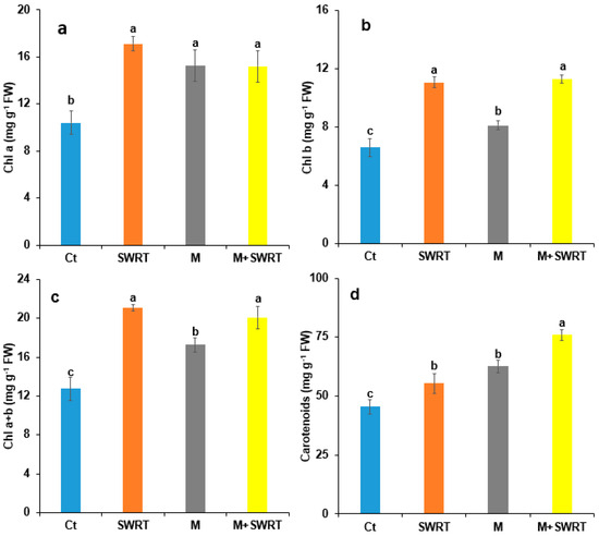 Our findings showed that the application of SWRT and/or mycorrhiza showed significant increases compared to the control plants (Figure 5). Indeed, the highest values were recorded in plants treated with SWRT with 71% increase for Chl a, followed by the combined treatment (M + SWRT) with a 64% increase for Chl b. Regarding total chlorophyll, M + SWRT showed an increase of 67% followed by SWRT treatment with 68% of enhancement compared to the control plants. For carotenoids, the combined treatment also showed the highest level of increase (67%) followed by mycorrhiza (38%) and then SWRT (22%) treatments.