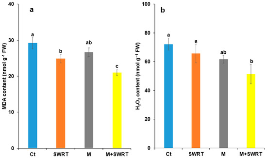 Malondialdehyde (MDA) results reveal a significant difference between SWRT, M, M + SWRT treatments and Ct (Figure 6a). M + SWRT-treated argan plants showed the greatest decline in MDA (33%) followed by the SWRT treatment (20%) compared to the control, while the lowest percentage (10%) was recorded in the argan trees treated with mycorrhiza only. In terms of H2O2 content, our findings showed high significant differences between M + SWRT and Ct, although the SWRT treatment had no significant difference compared with the control (Figure 6b). On the other hand, M + SWRT showed a significant reduction of 14% compared to the control, followed by M with 20% reduction compared to the control.