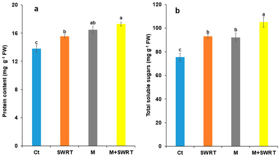 Data presented in Figure 7 reveal that protein and sugars contents exhibited a significant variation between the applied treatments. M + SWRT treatment demonstrated a significant difference for protein and soluble sugars compared to the control. Moreover, the highest protein content was recorded in M + SWRT-treated argan seedlings with an enhancement of 36% over the control, whereas the lowest value of this trait was recorded in SWRT-treated argan seedlings with an increase of 18% over the control. On the other hand, soluble sugars content displayed the highest increase under M + SWRT treatment with 57% enhancement, while the lowest improvement was recorded for M treatment (22%) compared to the Ct.
