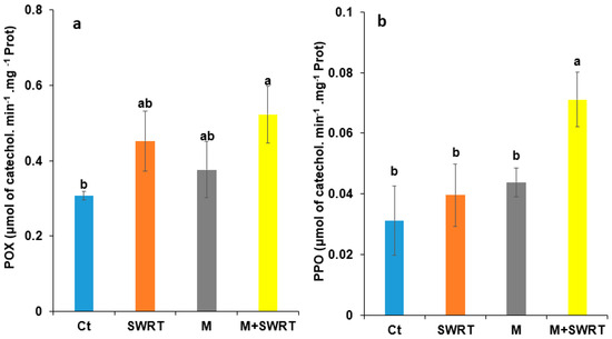 Our results showed significant variation of polyphenol oxidase (PPO) and peroxidase (POX) activities depending on the presence or absence of SWRT and/or mycorrhizae (Figure 8). The combined treatment (M + SWRT) displayed a significant increase over the Ct for both PPO and POX activities with increases of 129 and 70%, respectively, compared to the control. However, the separate application of SWRT and M treatments showed no significant increases compared to the control for both parameters.