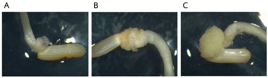 The different types of scutellum-derived callus formation: no callus induction (A), partial callus induction with incomplete embryogenic callus (B), and complete embryogenic callus induction (C).