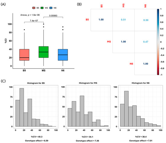 The callus induction (CI) percentages of the 110 rice accessions were evaluated across three tissue culture media: B5, MS, and N6. (A) The boxplot illustrates the percentage CI distribution analyzed using ANOVA and Tukey’s HSD test. (B) Correlation plots were generated to examine the relationships among the different media. (C) The histogram shows the distribution of the CI percentages in each medium.