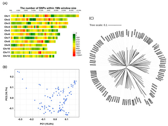 Genetic structure of the panel of 110 rice accessions: (A) SNP density on rice chromosomes, (B) principal component analysis (PCA) and kinship relatedness analysis of the 110 genotypes, and (C) population structure of the 110 rice accessions.