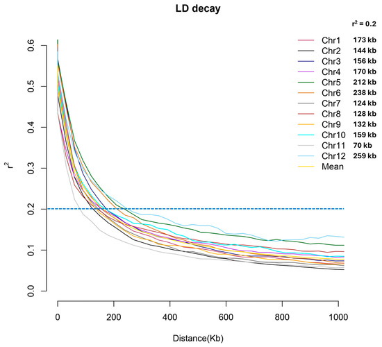 Linkage disequilibrium (LD) decay analyses were conducted in order to evaluate chromosomal signatures of recombination patterns (Figure 4). The mean LD decay values within intrachromosomal distance bins dropped below a threshold mean r2 value of 0.2 between 70 and 259 kb across all 12 chromosomes, with an average of 163.75 kb. The LD decay signatures were similar for all chromosomes except for chromosome 11, which exhibited a markedly lower threshold crossover point of 70 kb.