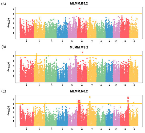 Manhattan plots resulting from genome-wide association study (GWAS) results for CI in three tissue culture media: (A) B5, (B) MS, and (C) N6. Yellow lines indicate the cut-off threshold at −log10 (p) of 5.0.