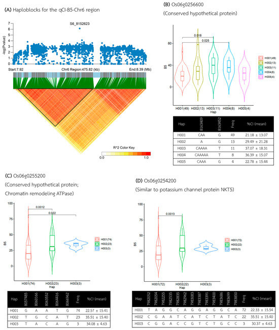 Analysis of associated regions and haplotype analysis within the qCI–B5–Chr6 region. (A) Manhattan plots and LD heatmap across the 475 kb region surrounding the significant SNP. The black triangle in the LD heatmap indicates the candidate haploblock. (B–D) Boxplots showing the distribution of %CI and haplotype analysis for the genes Os06g0256600, Os06g0255200, and Os06g0254200.