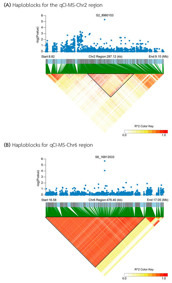 Analysis of associated regions and haplotypes within the qCI–MS–Chr2 (A) and qCI–MS–Chr6 (B) regions. The black triangles in the LD heatmaps indicate the candidate haploblock.