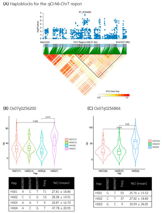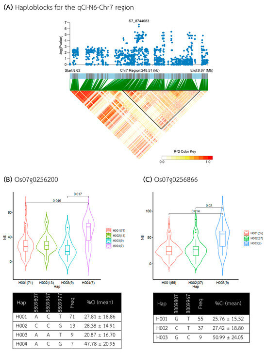 Analysis of associated regions and haplotype analysis within the qCI–N6–Chr7 region. (A) Manhattan plot and LD heatmap across the 248 kb region surrounding the significant SNP. The black triangle in the LD heatmap indicates the candidate haploblock. (B,C) Boxplots showing the distribution of %CI and haplotype analysis for the genes Os07g0256200 and Os07g0256866.