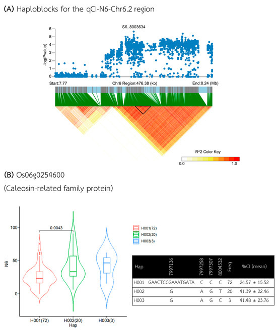 Analysis of associated regions and haplotype analysis within the qCI–N6–Chr6.2 region. (A) Manhattan plot and LD heatmap across the 476 kb region surrounding the significant SNP. The black triangle in the LD heatmap indicates the candidate haploblock. (B) Boxplot showing the distribution of %CI and haplotype analysis for the Os06g0254600 gene.