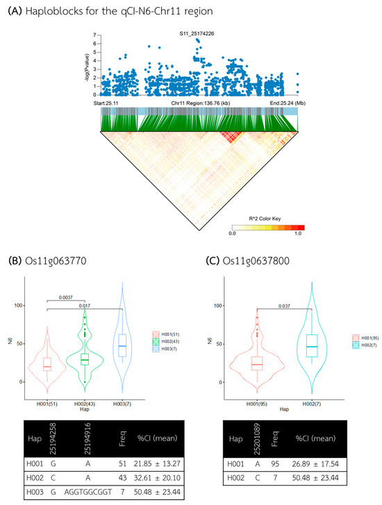 Analysis of associated regions and haplotype analysis of the qCI–N6–Chr11 region. (A) Manhattan plot and LD heatmap across the 136 kb region surrounding the significant SNP. The black triangle in the LD heatmap indicates the candidate haploblock. (B,C) Boxplots showing the distribution of %CI and haplotype analysis for the genes Os11g0637700 and Os11g0637800.