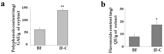 Polyphenols and flavonoid content. Folin–Ciocalteu reagent and aluminum trichloride allowed measurement of the content of polyphenols and flavonoids in both extracts. In panels (a,b), the contents of polyphenols and flavonoids are shown, respectively. Three independent experiments were performed, and the values were expressed as the mean ± sd. * denotes p < 0.05 vs. BF; ** denotes p < 0.01 vs. BF. A student’s test was applied.