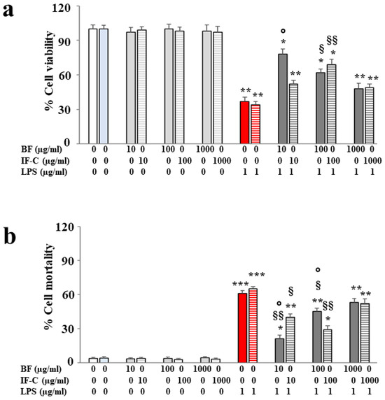 Viability and mortality of SHSY5Y cell line. Results of cell viability and mortality are reported in panels (a) and (b), respectively, following treatment with BF or IF-C b alone, LPS, and extracts + LPS. Viability experiments were conducted using the MTT test, while mortality was calculated using the Trypan blue exclusion assay. Three independent experiments were performed, and the values were expressed as the mean ± sd. * denotes p < 0.05 vs. CTRL; ** denotes p < 0.01 vs. CTRL; *** denotes p < 0.001 vs. CTRL; § denotes p < 0.05 vs. LPS; §§ denotes p < 0.01 vs. LPS; ° denotes p < 0.05 vs. IF-C at the same concentration. A Tukey comparison test followed variance analysis (ANOVA).