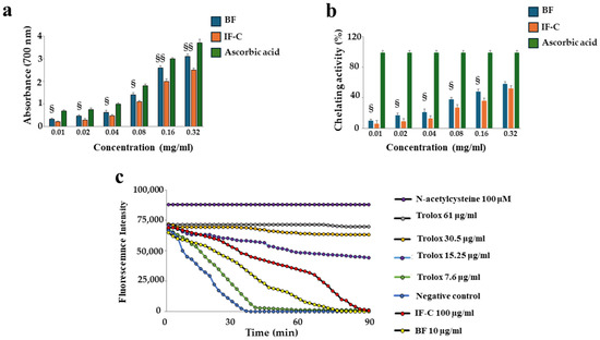 Evaluation of the antioxidant activity of BF and IF-C extracts in vitro. This figure represents the reducing power, chelating activity, and oxygen radical absorption capacity of extracts BF and IF-C, in panels (a), (b) and (c), respectively. Three independent experiments were performed, and the values were expressed as the mean ± sd. § denotes p < 0.05 vs. IF-C; §§ denotes p < 0.01 vs. IF-C. A Tukey comparison test followed variance analysis (ANOVA). In panel (c), a single representative experiment is shown.