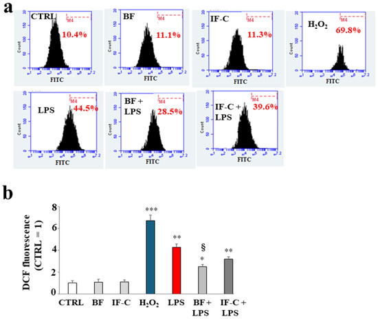 The accumulation of ROS was measured through cytofluorometer analysis: Figure 5 reports that the treatment with BF and IF-C alone did not result in any accumulation of ROS compared to untreated cells, while exposure to H2O2 (150 µM, 20 min), used as a positive control, resulted in a high and significant accumulation of ROS, as demonstrated by the shift on the right of the fluorescence peak. Treatment with LPS also led to an increase in ROS production, less evident than H2O2 and about four times that of untreated cells. Pre-treatment with BF and IF-C, followed by exposure to LPS, resulted in a significant reduction in the accumulation of ROS compared to LPS alone. However, BF reduces ROS by about 40%, while IF-C only by 20%. In panel b, the respective quantification of the results. represented in panel a, has been shown.