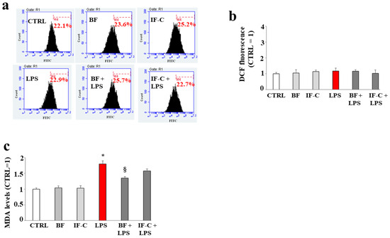 MDA accumulation. In panel (a), the absence of ROS, following treatment with LPS for 48 h, is shown. Each box refers to a treatment as indicated: the x-axis represents the fluorescence of the fluorochrome FITC connected to our fluorescent probe, while the y-axis is relative to the number of cells that we decided to acquire (10,000). At the top of each box, there is a marker (M4), which is arbitrarily drawn in the control and kept the same for all other samples. The part of the peak included in M4 is indicated by a numerical percentage. In panel (b), the respective quantification, obtained from comparing the percentages, is represented. The control percentage is arbitrarily made equal to 1 and the other values are related to it. Finally, in the panel (c), the MDA levels are represented. Three independent experiments were carried out, and the values are expressed as the mean ± standard deviation (sd). * denotes p < 0.05 vs. CTRL; § denotes p < 0.05 vs. LPS. A Tukey comparison test followed the analysis of variance (ANOVA). The results shown in panel (a), refer to a representative experiment of the three conducted.