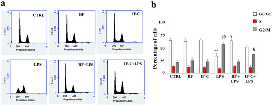Treatment with LPS caused an altered distribution of the cell cycle, visible in Figure 7a, as a block in phase G2-M at the expense of the G0-G1 phase. The G2-M phase constituted 22% of untreated cells and 56% of cells exposed to LPS. Pre-treatment with extracts of interest reverted the alterations of the cell cycle: BF reported the G2-M phase to 23% and these values are similar to those of untreated cells. IF-C reduced the block to 37%. Once again, BF worked better than IF-C, while BF and IF-C alone did not induce any alteration of the cell cycle. The respective quantification is shown in Figure 7b.