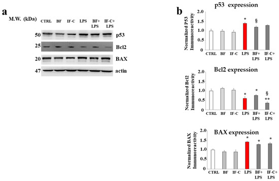 The damage induced by LPS modulates the expression of certain proteins. In panel (a), the expression of proteins p53, Bcl2, and BAX was represented following the indicated treatments. A representative experiment is shown. In panel (b), the respective quantification is highlighted. Three independent experiments were performed, and the values were expressed as the mean ± sd. * denotes p < 0.05 vs. the control; ** denotes p < 0.01 vs. the control; § denotes p < 0.05 vs. LPS. A Tukey comparison test followed the analysis of variance (ANOVA).