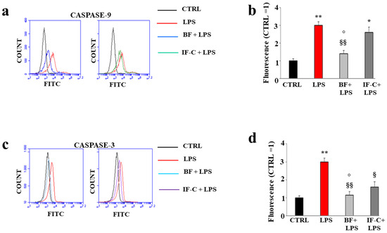 Effects of BF and IF-C on the expression of caspases. Monoclonal antibodies linked to fluorochromes were used to measure the expression of caspase 9 (panel (a)) and caspase 3 (panel (c)). A representative experiment was reported. In panels (b,d), the respective quantification is highlighted. Three independent experiments were performed, and the values were expressed as the mean ± sd. * denotes p < 0.05 vs. the control; ** denotes p < 0.01 vs. the control; § denotes p < 0.05 vs. LPS; §§ denotes p < 0.01 vs. LPS; ° denotes p < 0.05 vs. IF-C + LPS. A Tukey comparison test followed the analysis of variance (ANOVA).