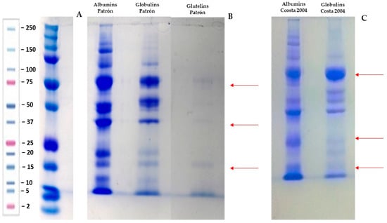 Once the protein fractions of the two varieties were obtained, their electrophoretic profiles were evaluated, both for the total proteins contained in the chickpeas and for each protein fraction. The electrophoretic profiles of the two varieties of chickpeas ‘Costa 2004’ and ‘El Patrón’ were evaluated for each protein fraction (Figure 1).