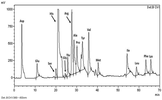 The results showed that chickpeas contain various essential amino acids, including arginine (Arg), phenylalanine (Phe), leucine (Leu), isoleucine (Ile), lysine (Lys), methionine (Met), threonine (Thr), and valine (Val), but not tryptophan, which was degraded during the hydrolysis of the sample, or cysteine signal, which was expected since various authors have reported that chickpea is low in this amino acid. Previous work has reported that methionine was present at low concentrations (0.8%) in the chickpea protein fraction, which is consistent with the results of this work [6]. Notably, the signals corresponding to aspartic acid, histidine, and arginine are more intense than those corresponding to the other amino acids present.