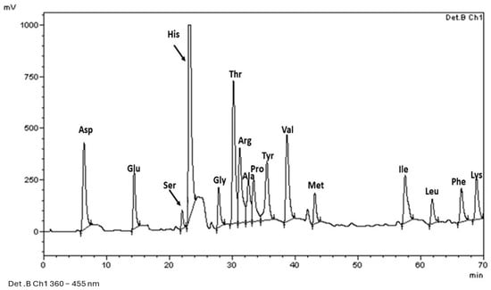 In this experiment, tryptophan was not detected since it is a sulfur-containing amino acid, which is found in limited quantities in chickpeas, primarily because it is present in the polyamine fraction [28]. As observed, chickpeas show low levels of this protein fraction, with concentrations measuring less than 1 g/100 g of protein in both varieties.