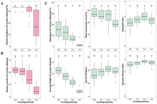 Figure 1. Effects of grazing on plant diseases and ecological indexes of plant communities. (A) changes in disease incidence in Leymus chinensis leaf spot; (B) changes in disease severity in L. chinensis leaf spot; (C) changes in ecological indexes: abundance in L. chinensis, average height of L. chinensis, coverage, species richness, Margalef index, and Shannon Wiener index. Different lowercase letters indicate significant differences at p < 0.05; G0, 0 standard bovine units per hectare; G1, 0.23 standard bovine units per hectare; G3, 0.46 standard bovine units per hectare; and G5, 0.92 standard bovine units per hectare.