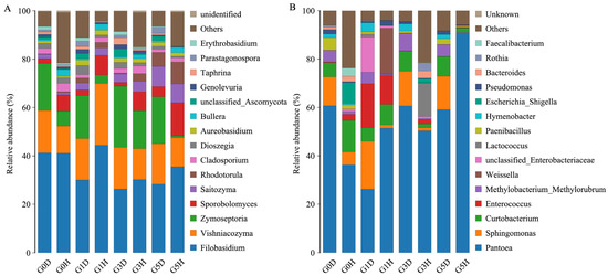 Figure 2. Stacked histograms of genus-level composition of epiphytic fungi (A) and epiphytic bacteria (B) in L. chinensis leaf spot diseased leaves versus healthy leaves under different grazing intensities. D stands for leaf spot diseased leaves, and H stands for healthy leaves. G0, 0 standard bovine units per hectare; G1, 0.23 standard bovine units per hectare; G3, 0.46 standard bovine units per hectare; and G5, 0.92 standard bovine units per hectare.