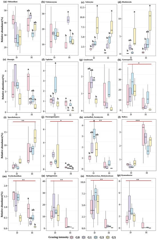 Figure 3. Box line plot of differences in relative abundance of epiphytic fungi (a–m) and epiphytic bacteria (n–p) selected micro-organisms. D represents leaf spot-diseased leaves and H represents healthy leaves. Different lowercase letters are used to indicate significant differences between different grazing intensities at p < 0.05, * indicates significant differences between leaf spot diseased leaves and healthy leaves, and the absence of labeled letters and * indicates no significant differences (* for p < 0.05, ** for p < 0.001, and *** for p < 0.0001). G0, 0 standard bovine units per hectare; G1, 0.23 standard bovine units per hectare; G3, 0.46 standard bovine units per hectare; and G5, 0.92 standard bovine units per hectare.