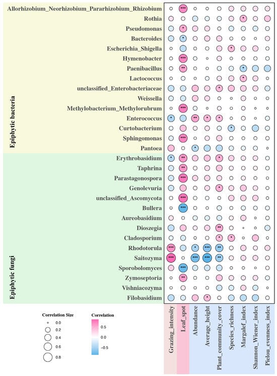 Figure 4. Heat map of correlation between environmental factors and epiphytic fungi and epiphytic bacteria. Red color is positive correlation, blue color is negative correlation, and the size of the circle represents the strength of the correlation. The darker the color and the larger the circle, the higher the correlation. * indicates a significant correlation (* is p < 0.05, ** is p < 0.01, *** is p < 0.001).