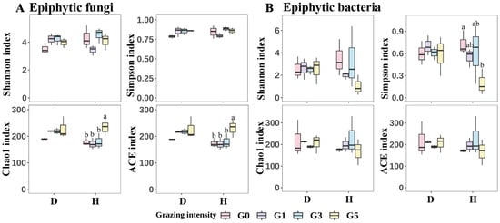 Figure 5. Box plots of differences in Alpha diversity indices for epiphytic fungi (A) and epiphytic bacteria (B). Different lowercase letters are used to indicate significant differences between grazing intensities (p < 0.05), and no labeled letters indicate no significant differences. D represents leaf spot-diseased leaves, and H represents healthy leaves. G0, 0 standard bovine units per hectare; G1, 0.23 standard bovine units per hectare; G3, 0.46 standard bovine units per hectare; G5, 0.92 standard bovine units per hectare.