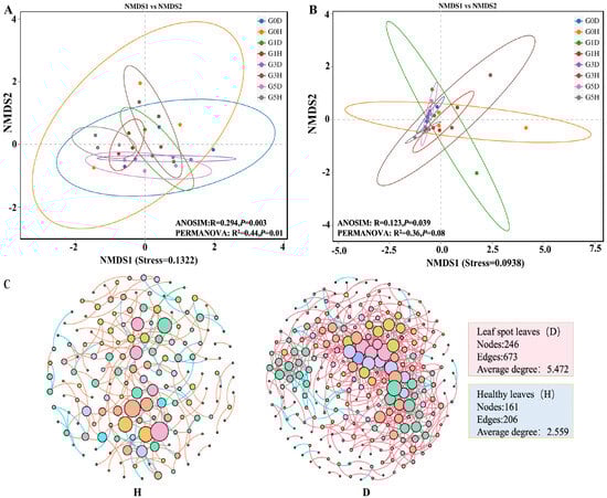 Based on the phyllosphere microbiome co-occurrence network diagram of leaf spot-diseased leaves versus healthy leaves, it was found that the connectivity and complexity of leaf spot-diseased leaves increased compared to healthy leaves (Figure 6C). Specifically, the nodes, the number of connections, and the number of connections per node were higher in the leaf spot-disease leaf network than in the healthy leaves.