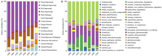 Figure 7. Stacked histograms of functional gene composition of epiphytic fungi (A) and epiphytic bacteria (B) under different treatments. G stands for grazing, the number represents the intensity of grazing, D stands for leaf spot diseased leaves, and H stands for healthy leaves. G0, 0 standard bovine units per hectare; G1, 0.23 standard bovine units per hectare; G3, 0.46 standard bovine units per hectare; and G5, 0.92 standard bovine units per hectare.