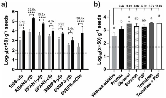 Variability in maize seed bacterization levels and protective effects within our Pseudomonas collection at the time of inoculation (0 dpi). The data represent transformed CFU values using the formula log10(x + 50), where x is the corresponding CFU value. This transformation is pertinent for statistical comparisons of data sets including CFU null data []. Dashed lines indicate the log10 value corresponding to a transformed null CFU count. (a) Recovery of culturable Pseudomonas from maize seeds inoculated in the presence (black) or absence (grey) of the commercial bacterial protectant Premax® (Rizobacter Argentina S.A., Pergamino, Argentina). Asterisks indicate statistically significant differences between treatments with or without Premax® (ANOVA with LSD-Fisher multiple comparison test; * p < 0.05, *** p < 0.001, **** p < 0.0001). Numbers above treatment bars indicate fold increase in bacterial recovery for treatments with Premax® compared to the corresponding control. (b) Effect of different additives on recovery of SVMP4-yfp from maize bacterized seeds. Different letters indicate statistically significant differences (ANOVA with LSD Fisher’s multiple comparison test, p < 0.05). Numbers above bars indicate the fold increase in bacterial recovery for treatments with additives compared to the corresponding control.