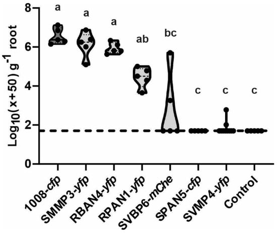To analyze if the Pseudomonas isolates can occupy the rhizosphere of maize from bacterized seeds competing with the natural soil microflora, we designed a greenhouse assay. We used 1 L pots filled with sterilized perlite and natural soil mixed in 1:1 volume ratio, with one plant per pot and five plants per treatment (n = 5). The soil was obtained from a pristine environment located in Llavallol, Buenos Aires Province, Argentine (34°47′12.8″ S, 58°26′28.6″ W), and sieved by a 2 mm mesh prior to use. Non-disinfected maize seeds (variety KM 87 VIP3) were inoculated with the optimal additive for each isolate (Premax® for RBAN4-yfp, SMMP3-yfp, RPAN1-yfp, SPAN5-cfp, and the reference 1008-cfp; trehalose–PVP mixture for SVMP4-yfp and SVBP6-mChe) or treated with saline solution for the negative control. Pots were incubated under greenhouse conditions with temperature and humidity ranging from 20 to 24 °C and from 60 to 80%, respectively; and a day–night cycle of 16–8 h (supplemented with artificial light to mitigate seasonal variations in the natural photoperiod). Substrate humidity was maintained at field capacity with sterilized distilled water applied 3 times a week. After 1 month of incubation (V3-V4 maize stage), plants were harvested and the root systems were gently shaken to remove large, adhered soil particles and obtain the “rhizospheric sample” (i.e., the complete root system with the small soil particles tightly adhered to its surface). Rhizospheric samples were collected and kept at 4 °C until processing as previously described [] to quantify bacterial colonization using the drop plate assay []. Total heterotrophic, mesophilic, and culturable bacteria were quantified by plating onto diluted tryptone soy agar (TSA 10%, Biokar, Cedex, France) supplemented with cycloheximide 100 µg mL−1 (Anedra, Buenos Aires, Argentina) to inhibit fungal growth []. Specific counts for each inoculated isolate were performed on S1 agar plates supplemented with cycloheximide 100 µg mL−1 and the corresponding antibiotic for each isolate. For isolates resistant to both Km and Sm (Table 1), plates were supplemented with both antibiotics to prevent growth of soil microflora with natural Km resistance. Colony counts were conducted after 48 h of incubation at 28 °C. At the time of plant harvest, we measured the height of the aerial part, the length of the primary root, and the fresh and dry weight of the aerial part, as well as the fresh weight of the whole root system after removing large and loosely adhered soil particles. A subsample of the root system was dried to determine bacterial colonization density based on dry root biomass.