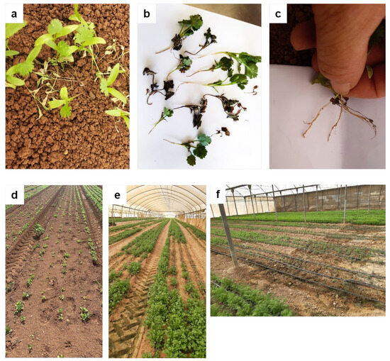 The wilting of coriander has been observed in the fields in Israel during the summer season, starting approximately in 2012. Affected plants display wilting, foliar chlorosis, defoliation, and browning of the roots and crown. As symptoms progress, plants collapse and die (Figure 1a–c). The disease mainly affects young seedlings and can lead to complete yield loss (Figure 1d–f). The symptoms usually become apparent within two weeks of sowing. Since 2018, the phenomenon has become an epidemic throughout coriander cropping areas in Israel. In addition, the phenomenon is no longer limited to the summer months and can be observed as early as April, extending as late as November.