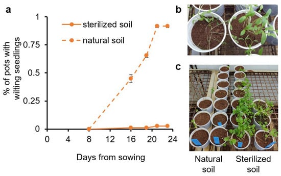Coriander wilting in sterilized and naturally infested soil. The coriander cultivar Ya’ara was sowed in soil collected from a field with dumping-off history in a growth chamber at 27 °C. Half of the soil was sterilized (solid lines) and half was untouched (dashed lines). (a) The percentage of pots with wilting seedlings. The values are means of two replicates ± SEM. Each replicate contained at least 30 pots for each treatment. (b) Wilting phenomenon. (c) The final status of the experiment after 10 weeks.